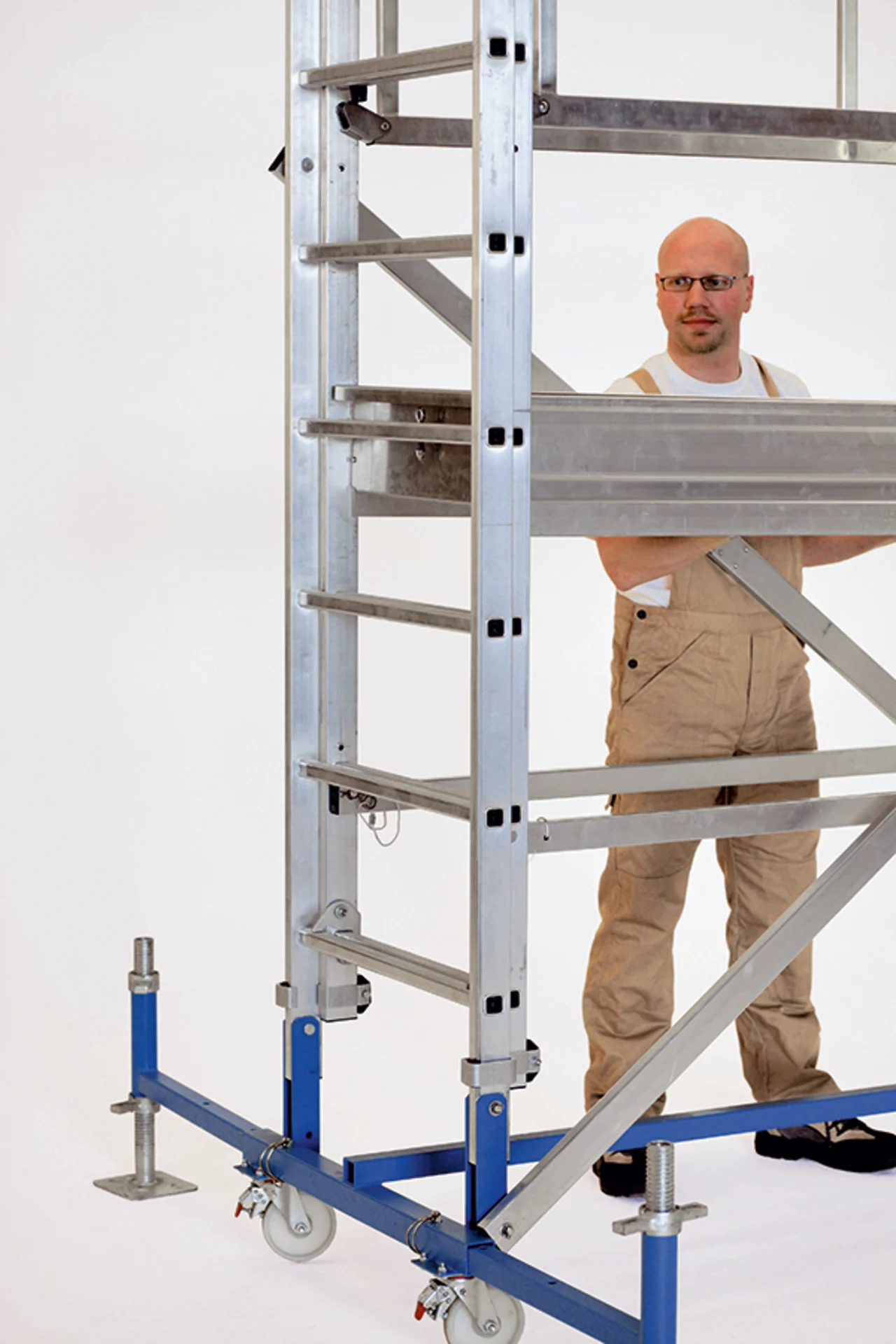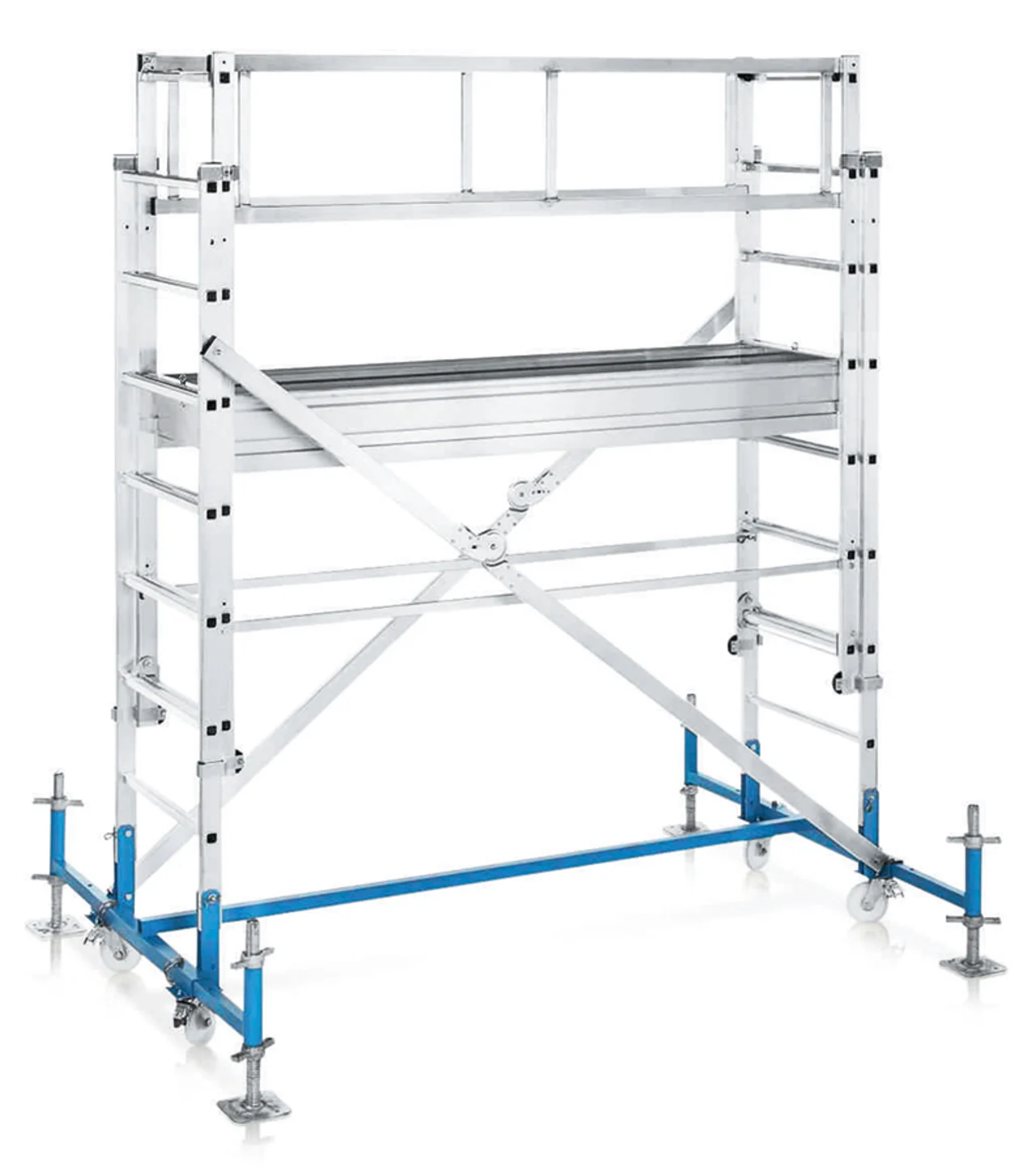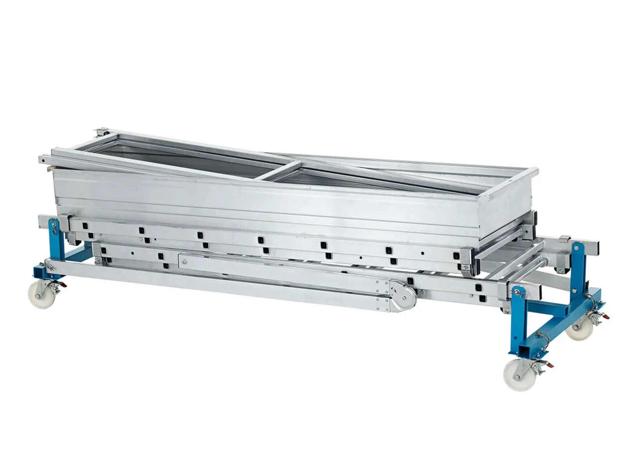 Nagyméretű járólap 0,50 m x 1,95 m illetve 0,60 m x 2,50 m. Körbe futó korlát a maximális munkabiztonságért. Egyszerű magasságállítás az automatikusan záródó tolólétra elv alapján, így lehet különböző magasságokat egy munkaállvánnyal elérni. Egyszemélyes magasságállítás. A szállításhoz és a tároláshoz egyszerűen összecsukható. Kihúzható kitámasztó stabil orsókkal a megfelelő stabilitásért és a talajegyenetlenségek kiküszöbölésére.