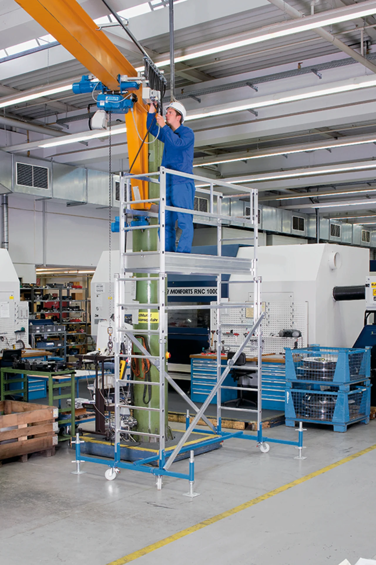 Belső térben a használat során nem szükségesek a ballasztsúlyok. Két méret magasságállítási lehetőségekkel: A járólapmagasság 1,25m-től – 2,46 m-ig illetve 1,81 m-től 3,58 m-ig. A DIN EN 1004 szerinti 3-as állványcsoport (terhelhető 200 kg/m2-ig). A kerekeknek köszönhetően felállított és összecsukott állapotban is könnyen mozgatható.